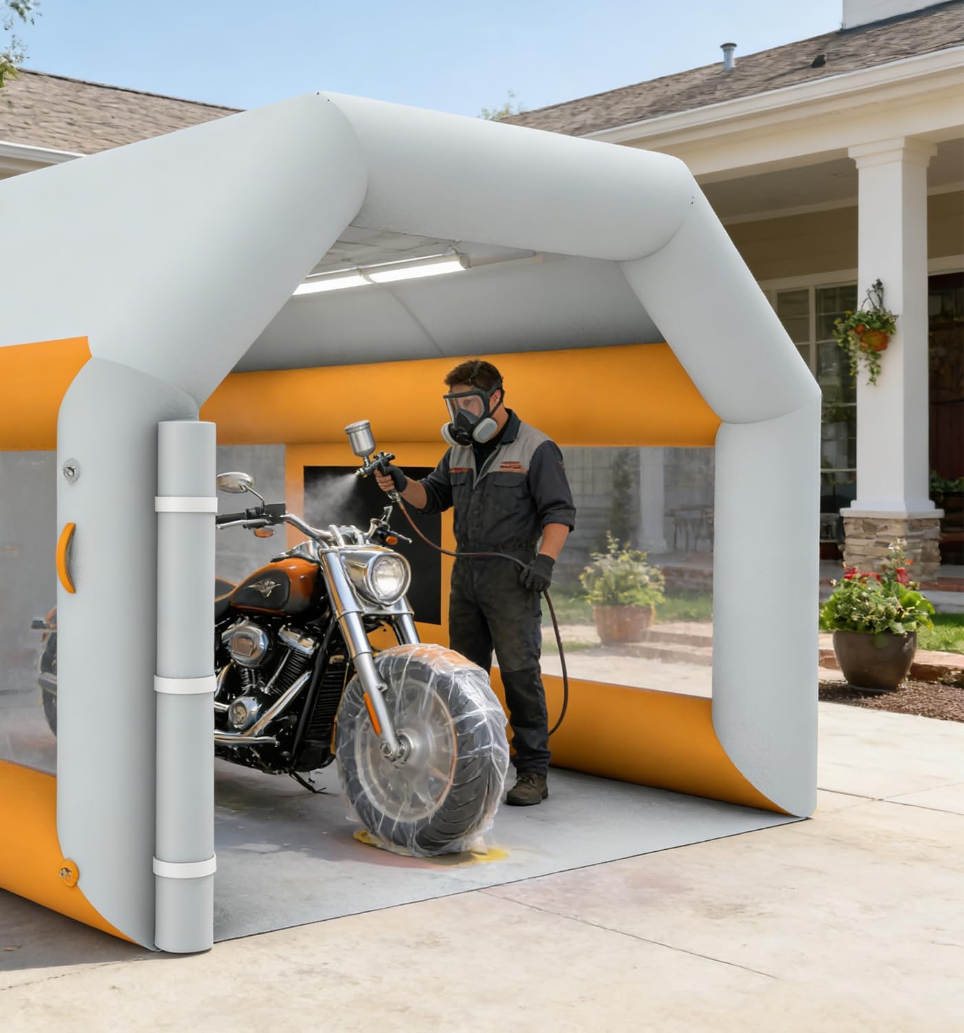 Upgrade your workspace with this 10 x 8.5 x 7 FT Inflatable Paint Booth, designed for DIY enthusiasts and home garage projects. Built with durable 210D Oxford fabric combined with PVC material, this spray booth offers enhanced tear resistance and reinforced double-stitched seams for reliable, repeated use. The surface features a light water-resistant coating, helping protect against minor splashes and light outdoor moisture. (Please note: not intended for heavy rain or prolonged water exposure.) Equipped with a 550W high-power blower, the booth inflates within minutes and maintains consistent airflow during operation. The integrated filtration chamber with filter cotton helps reduce dust, dirt particles, and airborne debris while assisting in minimizing paint odors and fumes. This creates a cleaner and more controlled environment for spraying tasks. Transparent PVC side windows allow natural daylight to enter, improving interior brightness and visibility during daytime work. Whether you're painting automotive parts, motorcycles, furniture, cabinets, or craft projects, the clear workspace helps support more precise results. Designed for convenience, this portable paint booth inflates quickly and deflates easily for compact storage. Ideal for use in garages, driveways, or backyard spaces, it provides a practical solution for controlled spray painting projects at home.